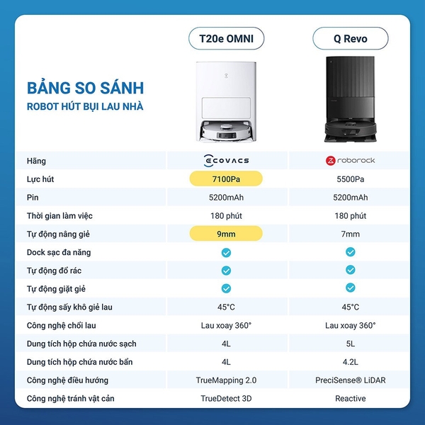 T20e cung cấp lực hút 7100Pa, hiệu suất làm sạch mạnh mẽ, cung cấp giải pháp dọn dẹp nhà cửa hiệu quả tối ưu, khả năng tự động nâng tấm lau thông minh, dễ dàng tiếp cận sát mép cạnh giúp vệ sinh mọi khu vực trên sàn. Trạm sạc OMNI thế hệ mới toàn năng, tất cả trong 1, tự động giặt và sấy khô giẻ lau bằng khí nóng, làm trống hộp bụi, sạc pin cho trải nghiệm làm sạch nhà rảnh tay, không gian sống sạch sẽ, thoáng mát và tươi mới. T20e Omni sử dụng hệ thống lau nhà xoay OZMO ™ Turbo 2.0 tăng cường khả năng làm sạch sâu và toàn diện. Công nghệ TrueDetect 3D 3.0 và TrueMapping 2.0 tiên tiến cho phép điều hướng chính xác, lập bản đồ và lên kế hoạch dọn dẹp tối ưu, biến việc làm sạch nhà hoàn toàn tự động trở thành hiện thực. Tính năng sạc thông minh cho hiệu suất sử dụng pin cao hơn, giúp ngôi nhà luôn sạch sẽ, mang lại trải nghiệm vệ sinh nhà cửa hiệu quả mọi ngóc ngách mà không can thiệp, góp phần nâng cao chất lượng cuộc sống.