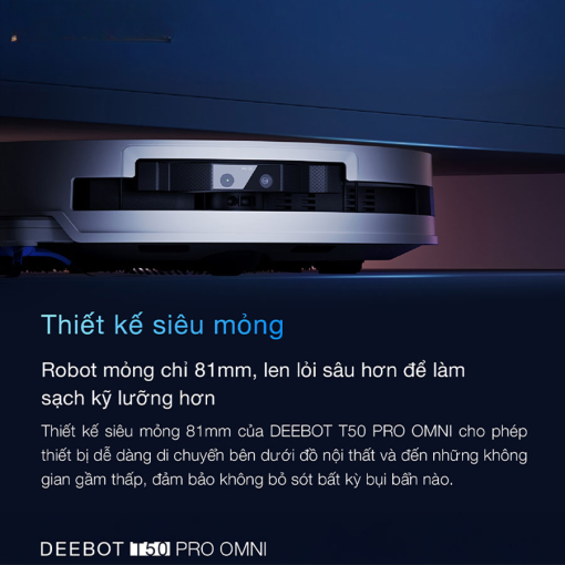 Với thiết kế siêu mỏng chỉ dày 81mm, Ecovacs T50 Pro Omni Auto Water Kit có thể làm sạch dễ dàng tại mọi khu vực địa hình, từ khu vực bằng phẳng, dễ tiếp cận đến các khu vực góc cạnh, thậm chí là khu vực gầm thấp như gầm giường, gầm tủ, gầm ghế sofa,… Nhờ việc tiếp cận được nhiều khu vực một cách dễ dàng, robot Ecovacs Deebot T50 Pro Omni Auto Water Kit có thể loại bỏ mọi loại vết bẩn, đảm bảo cho ngồi nhà của bạn luôn ở trạng thái sạch sẽ, không bị ô nhiễm. Tuy có thiết kế mỏng và nhẹ, nhưng Ecovacs T50 Pro Omni Auto Water Kit vẫn sở hữu rất nhiều công nghệ làm sạch “siêu khủng”, mang đến những trải nghiệm đỉnh cao và hài lòng nhất.