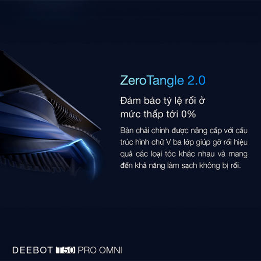 Công nghệ chống rối ZeroTangle thế hệ thứ 2 của Ecovacs T50 Pro Omni Auto Water Kit sẽ khiến bạn phải kinh ngạc. Điểm mấu chốt của công nghệ này chính là sự kết hợp giữa cấu trúc bàn chải xoắn ốc hình chữ V, đầu ống dẫn thẳng và đầu luợc, đảm bảo 0% tỉ lệ tóc rụng bị rối, hạn chế được các thao tác vệ sinh thủ công tại chổi chính. Cụ thể hơn, bộ phận chổi chính chống rối có hình chữ V được đặt nghiêng một góc 45°, kết hợp bàn chải xoắn ốc hình chữ V dài 18cm cùng răng lược hình chữ V hai chiều. Đầu ống dẫn thẳng cũng được thiết kế chủ yếu dùng để cuốn toàn bộ phần tóc, lông vào trong hộp chứa. Cuối cùng là đầu lược giúp làm tơi và làm mượt tóc, lông thú cưng trong quá trình đi hút bụi. Sự kết hợp này của công nghệ chống rối ZeroTangle 2.0 trên Ecovacs T50 Pro Omni Auto Water Kit sẽ loại bỏ hoàn toàn tình trạng rối tóc, rối lông, cho bạn trải nghiệm nhẹ nhàng hơn.